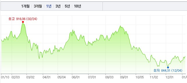 2020년 2월에는 최고 916원까지 기록하였으나 9월 이후 급락세를 기록하며 최저 840원 초반까지 떨어졌습니다. 연말을 지나면서 850원대를 유지하고 있는 중이네요. 2021년을 거쳐 다시 900원대로 상승하여 계속 유지중입니다.