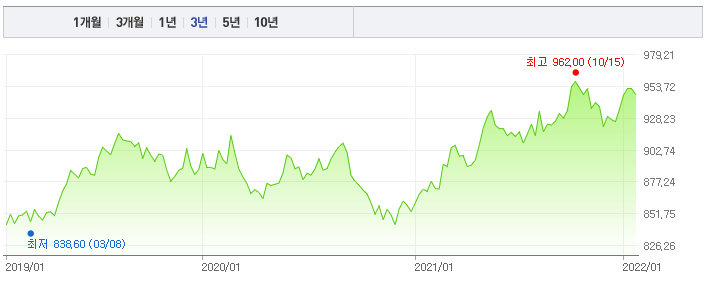 | 2022 | 4월 | 940.22 | 911.74 | 925.62 | -1.56% |